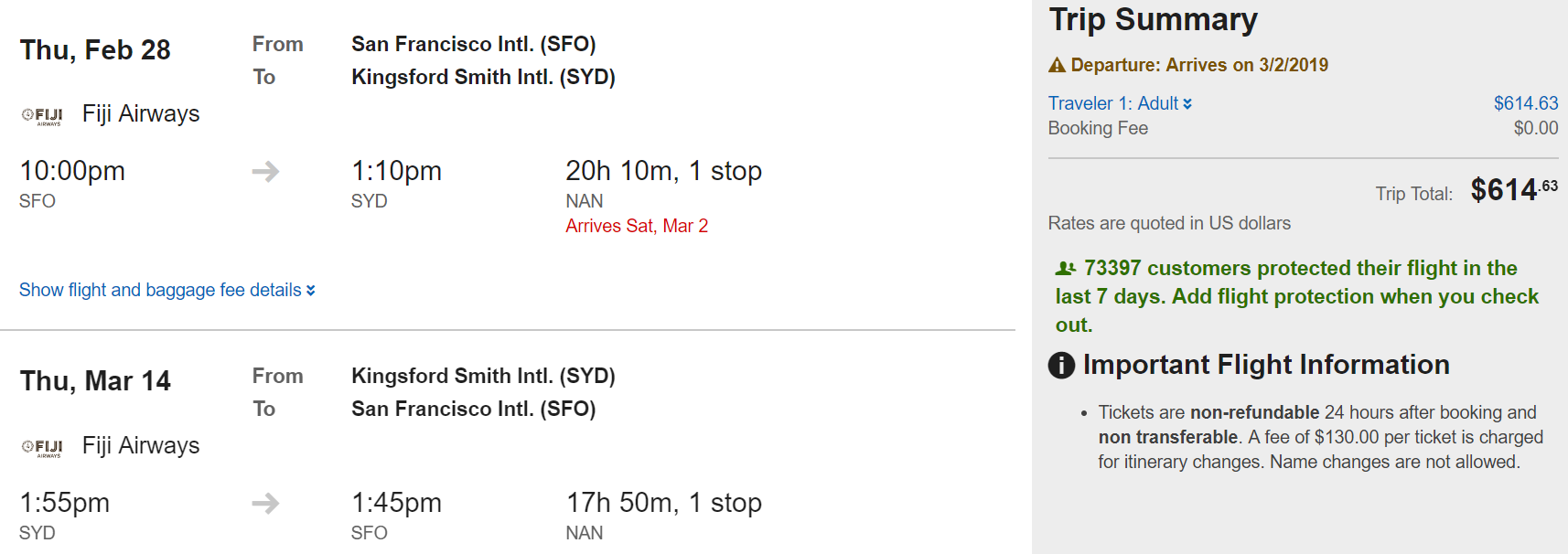 San Francisco (SFO) to Sydney (SYD) for $615 round-trip on Fiji Airways: