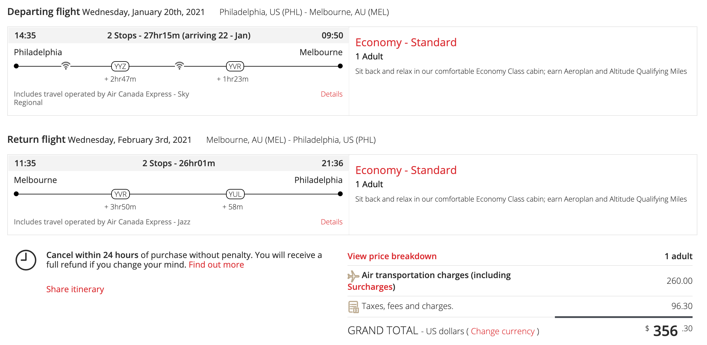 Philadelphia (PHL) to Melbourne (MEL) for $356 round-trip on Air Canada:
