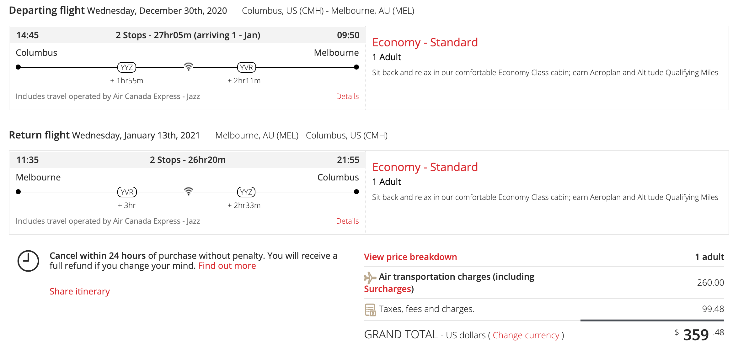 Columbus (CMH) to Melbourne (MEL) for $359 round-trip on Air Canada: