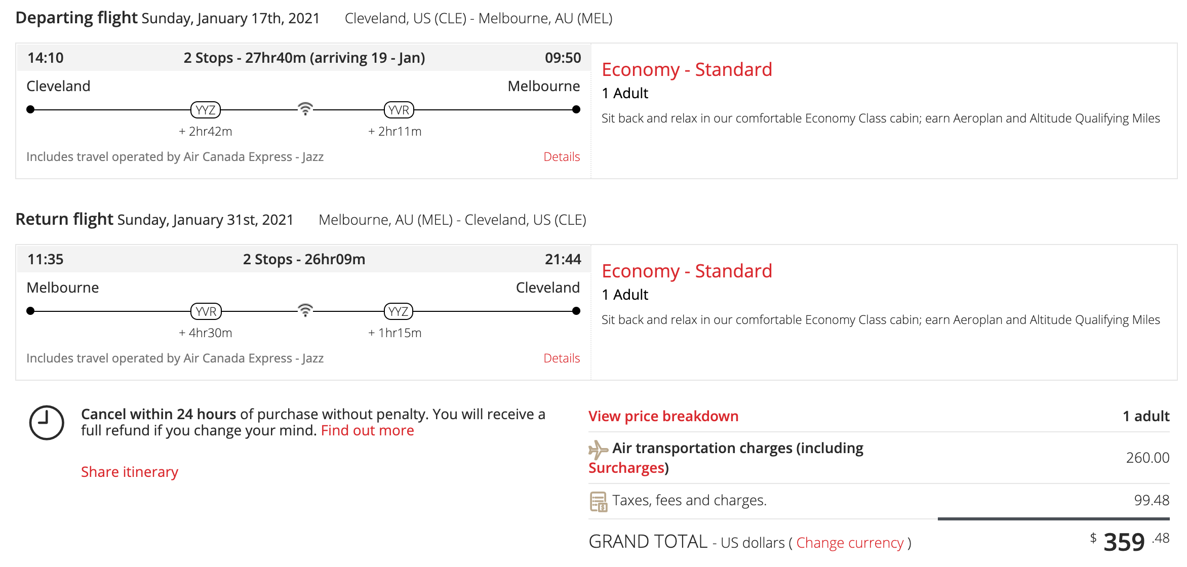 Cleveland (CLE) to Melbourne (MEL) for $359 round-trip on Air Canada: