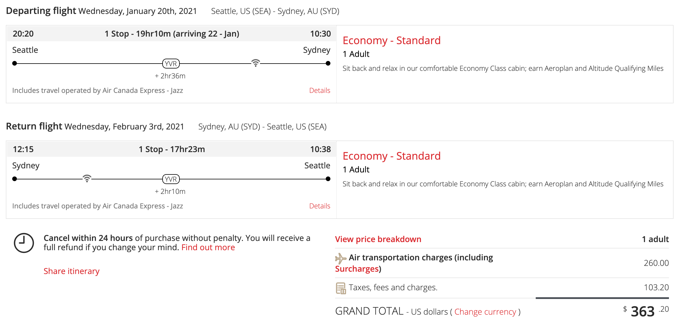 Seattle (SEA) to Sydney (SYD) for $363 round-trip on Air Canada: