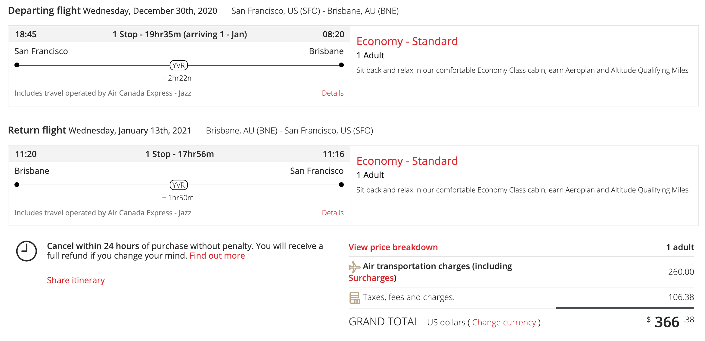 San Francisco (SFO) to Brisbane (BNE) for $366 round-trip on Air Canada: