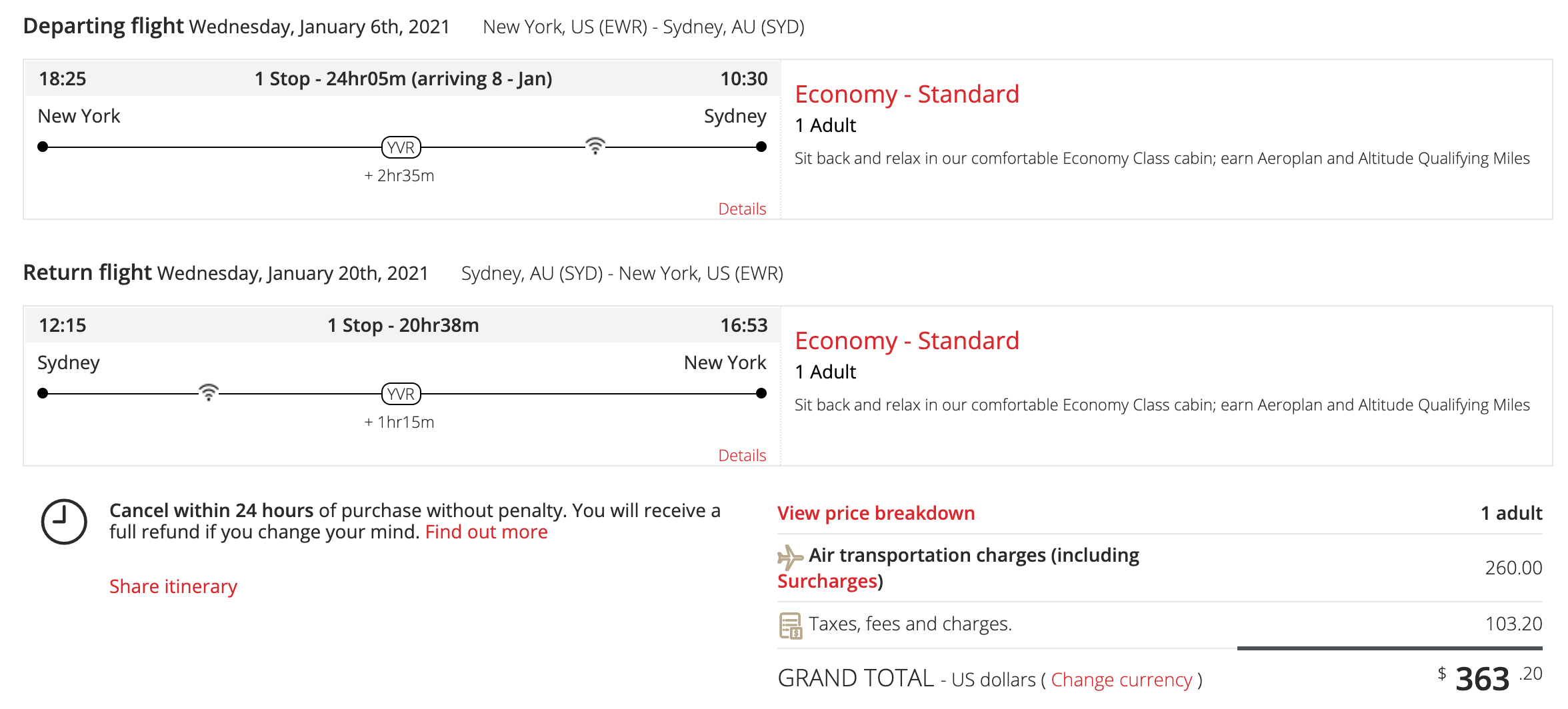 Newark (EWR) to Sydney (SYD) for $363 round-trip on Air Canada: