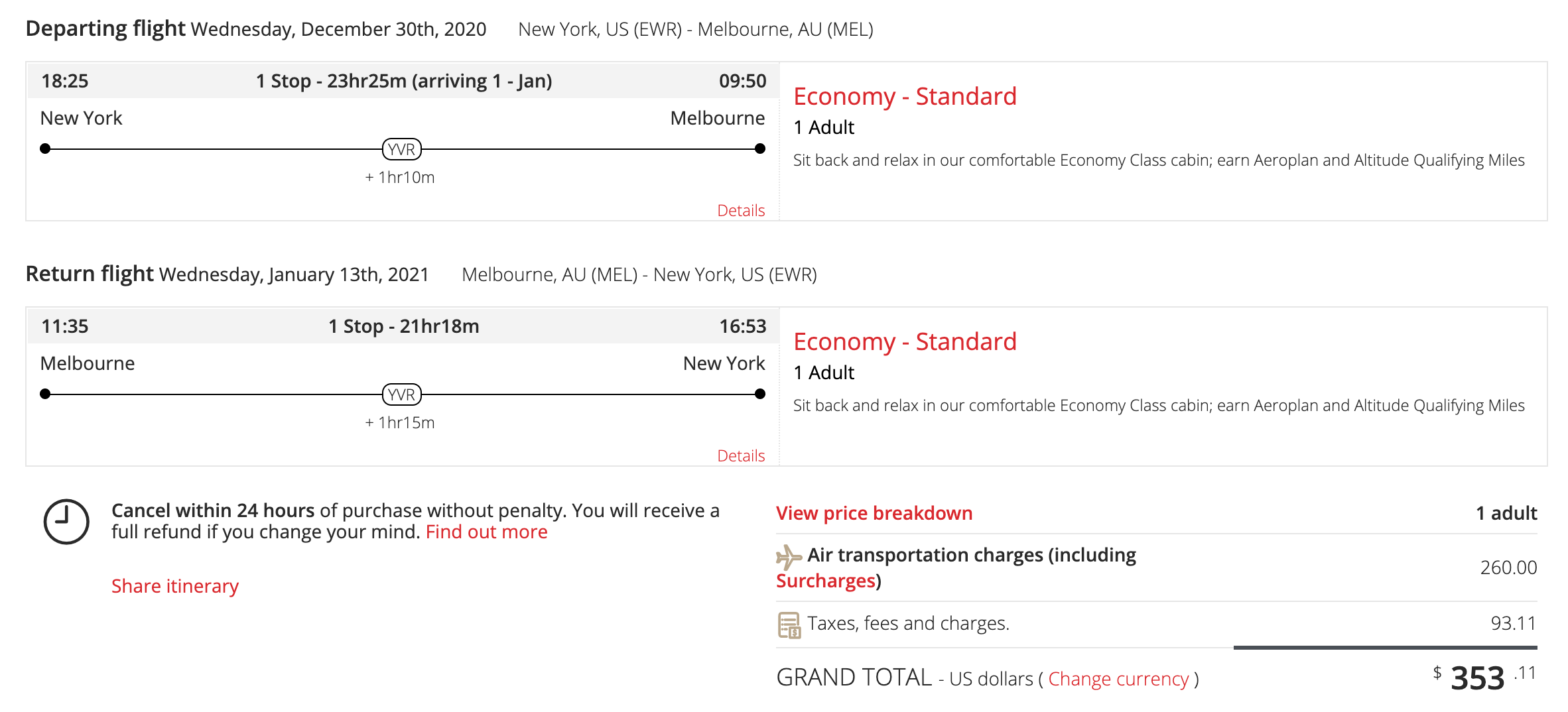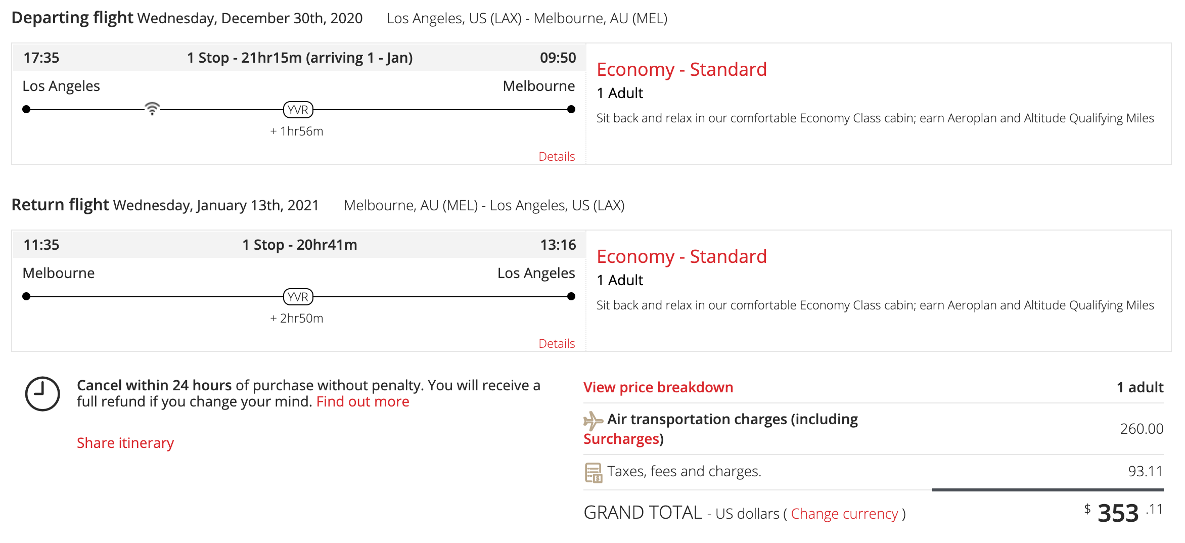 Los Angeles (LAX) to Melbourne (MEL) for $353 round-trip on Air Canada: