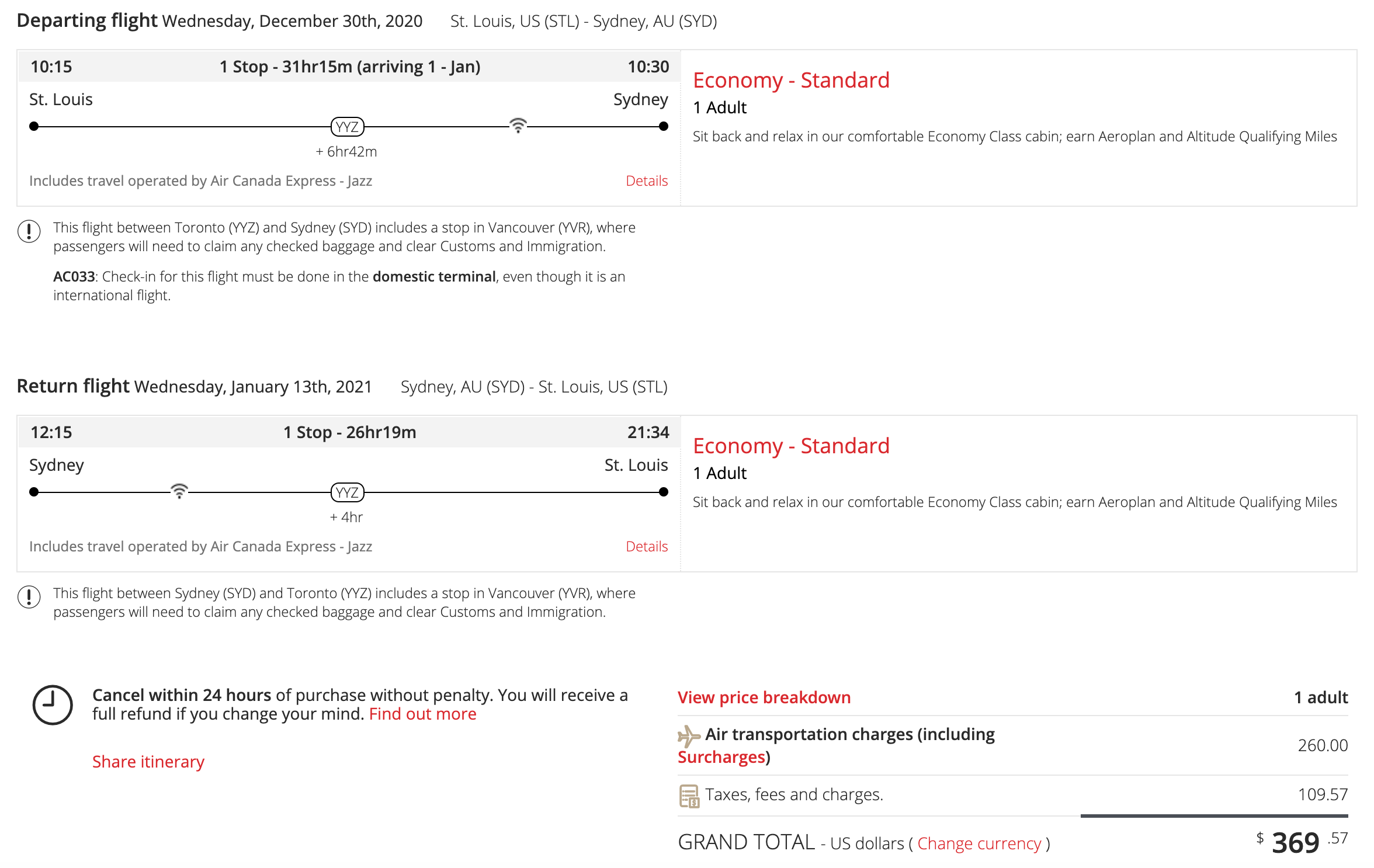 St. Louis (STL) to Sydney (SYD) for $369 round-trip on Air Canada: