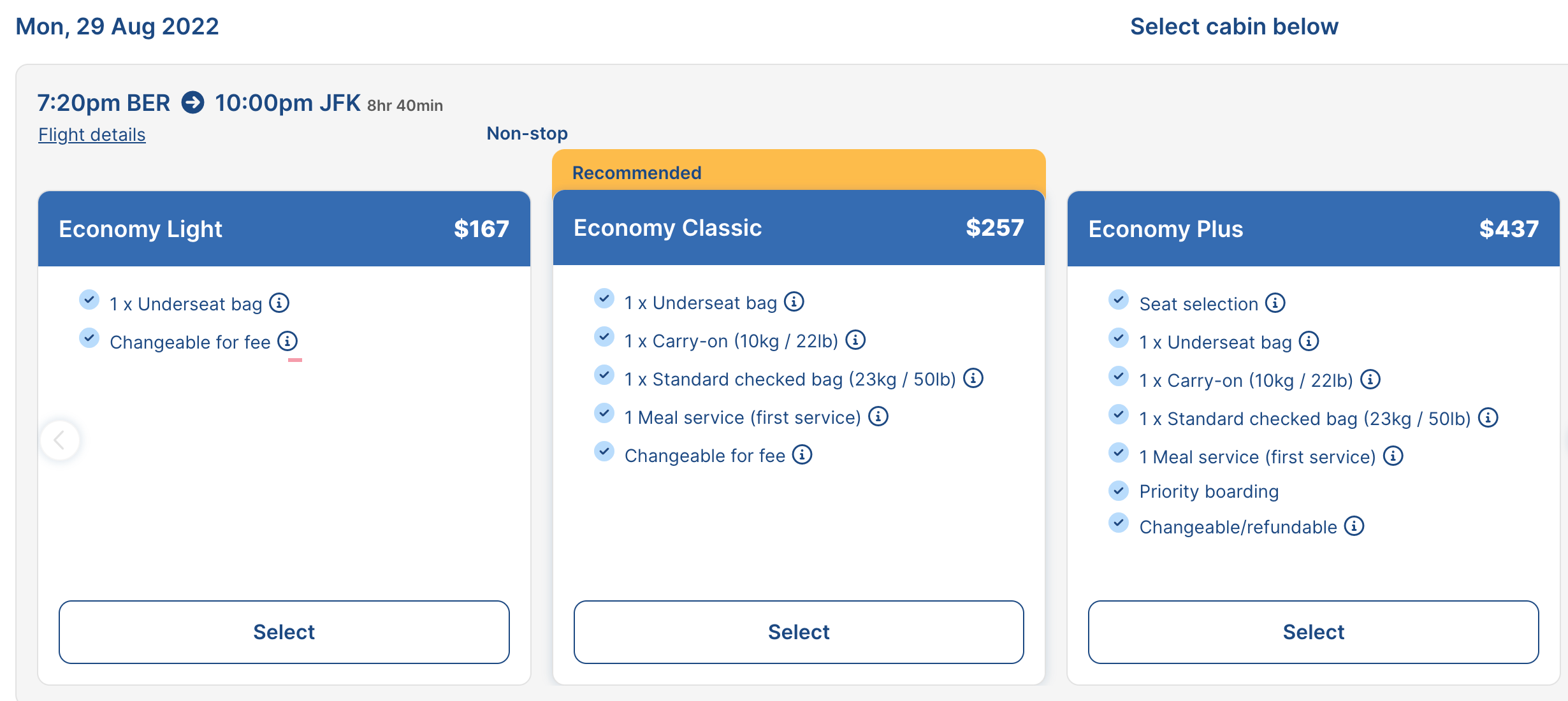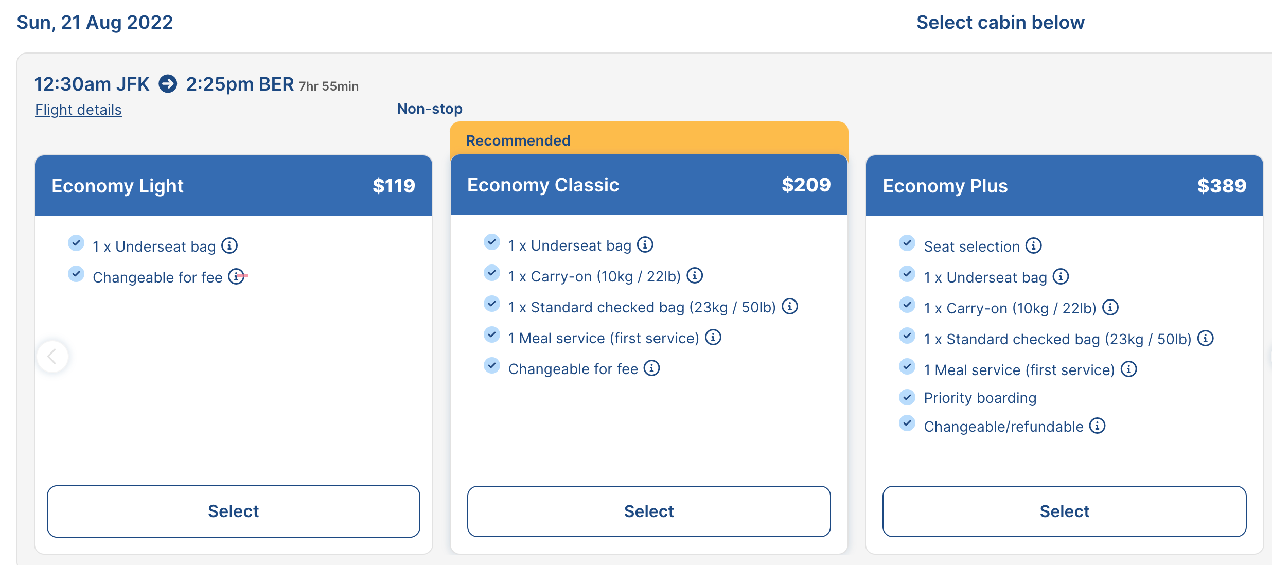 The sale fares on Norse Atlantic are not on Google Flights yet. You have to go to the carrier's website to book these. But we found lots of availability for flights as low as $119 one-way to New York City's JFK Airport. The lowest prices are for Norse's Economy Light, its most basic tier. That fare doesn't include a free carry-on, so you may want to consider bumping up to Economy Classic, which is still a nice price at $209.