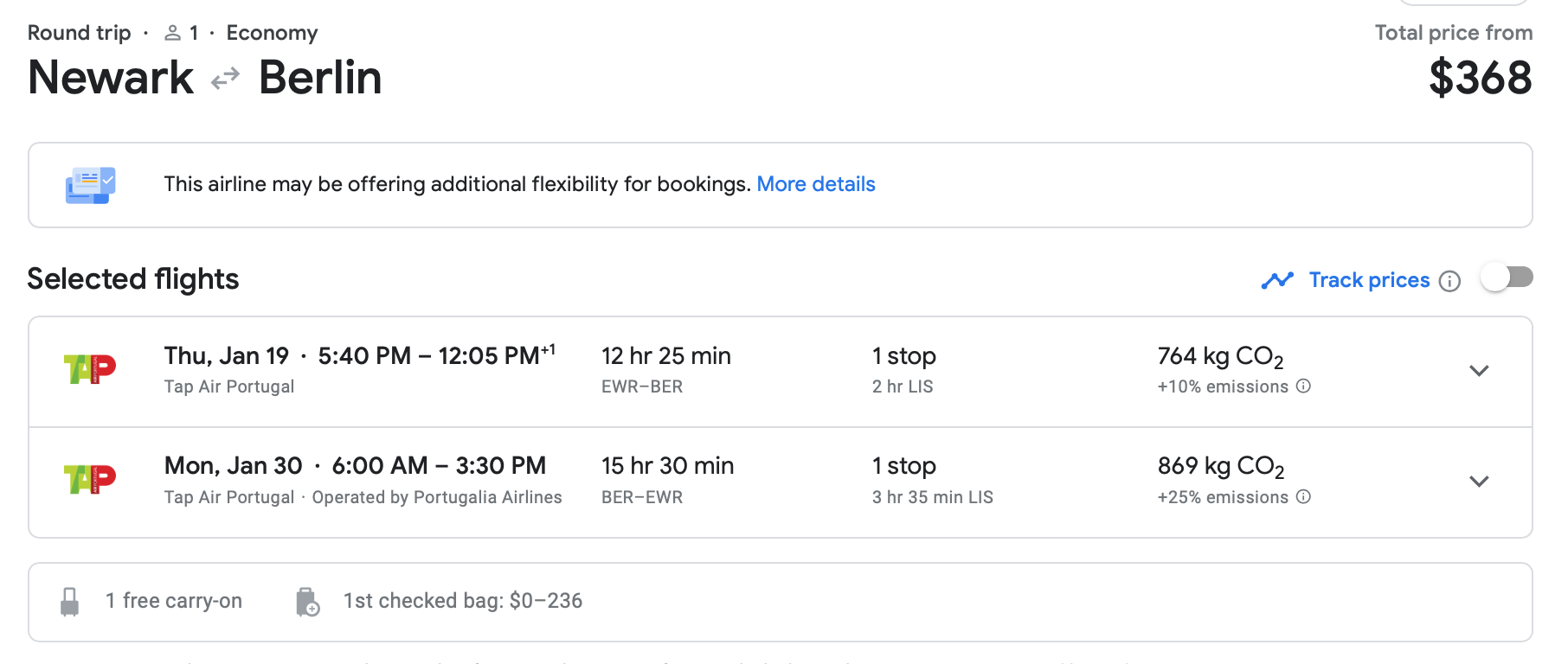 We also found good prices on flights in January from Newark Liberty International Airport (EWR) to Berlin on TAP Air Portugal for only $368 round-trip. This includes a layover in Lisbon, Portugal, but you do get a free carry-on bag with this fare. FYI, we found much more availability and better prices out of Newark to Berlin than we saw for flights out of JFK.