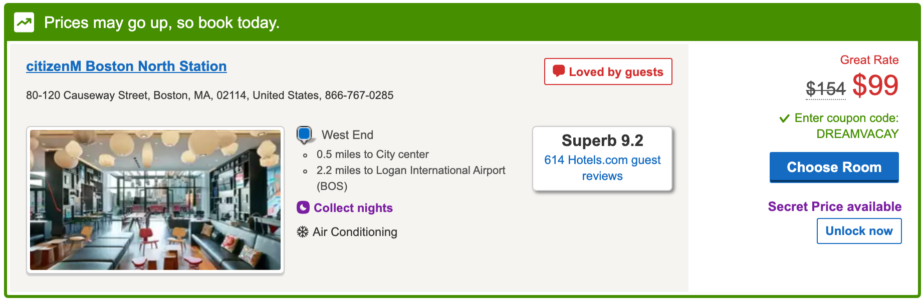 citizenM Boston North Station for $99 per night, plus taxes and fees, in December via Hotels.com: