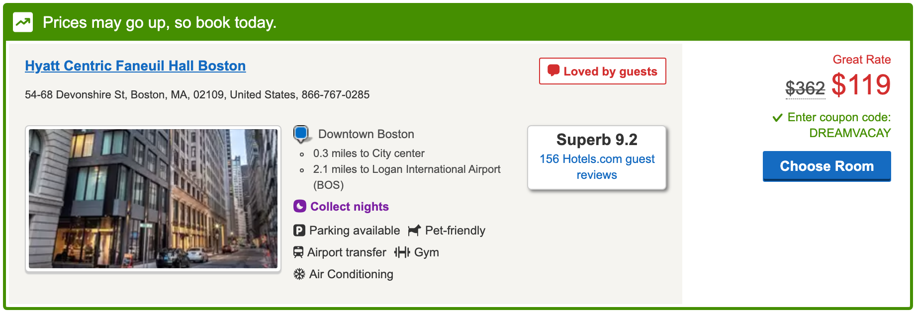 Hyatt Centric Faneuil Hall Boston for $119 per night, plus taxes and fees, in December via Hotels.com: