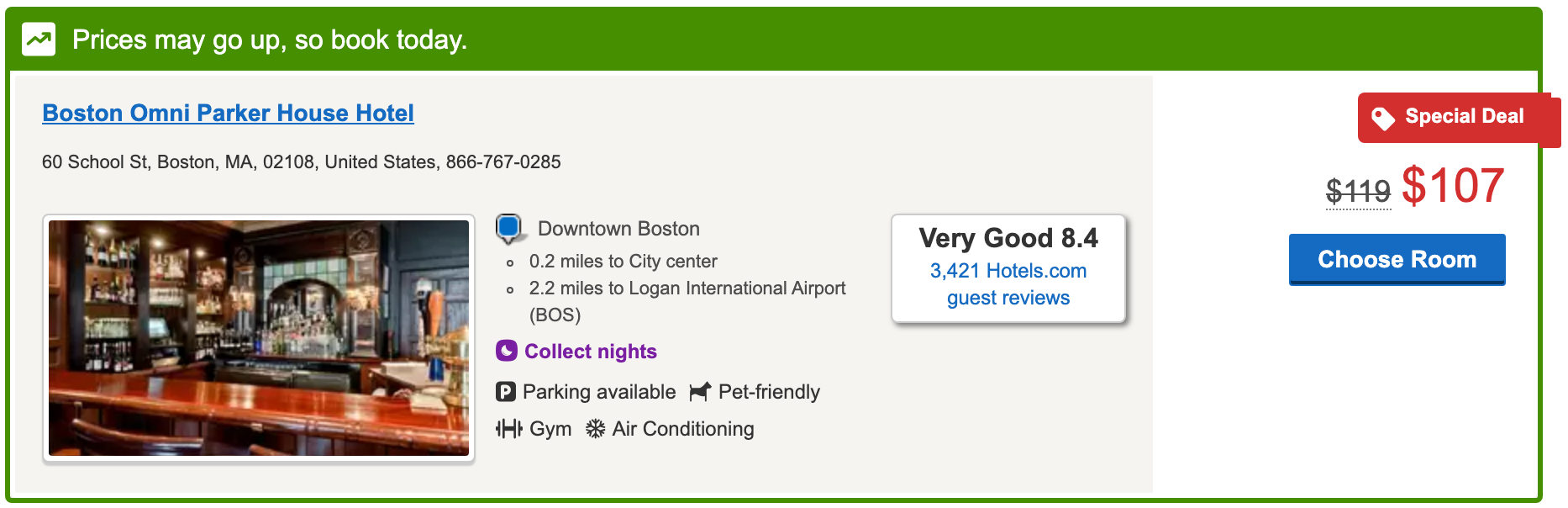 Boston Omni Parker House Hotel for $107 per night, plus taxes and fees, in December via Hotels.com: