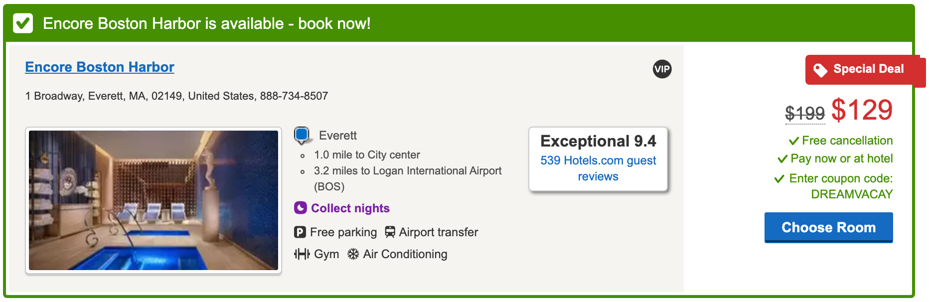 Encore Boston Harbor for $129 per night, plus taxes and fees, in January via Hotels.com: