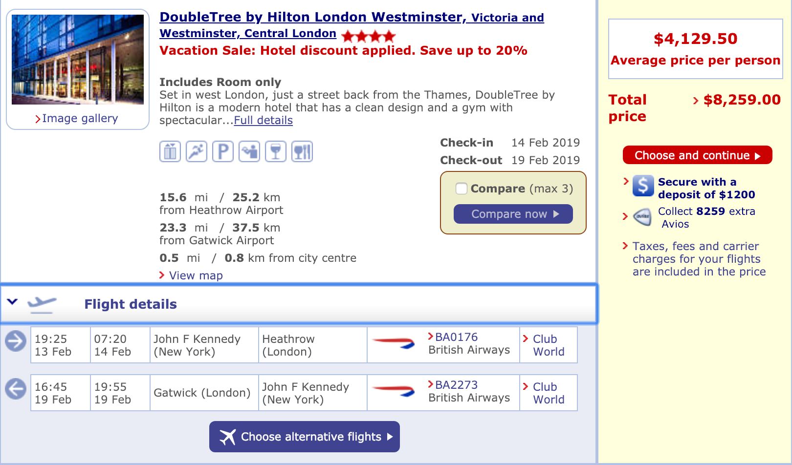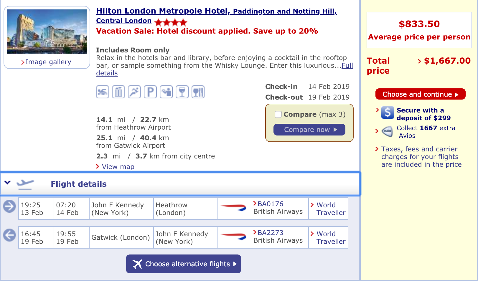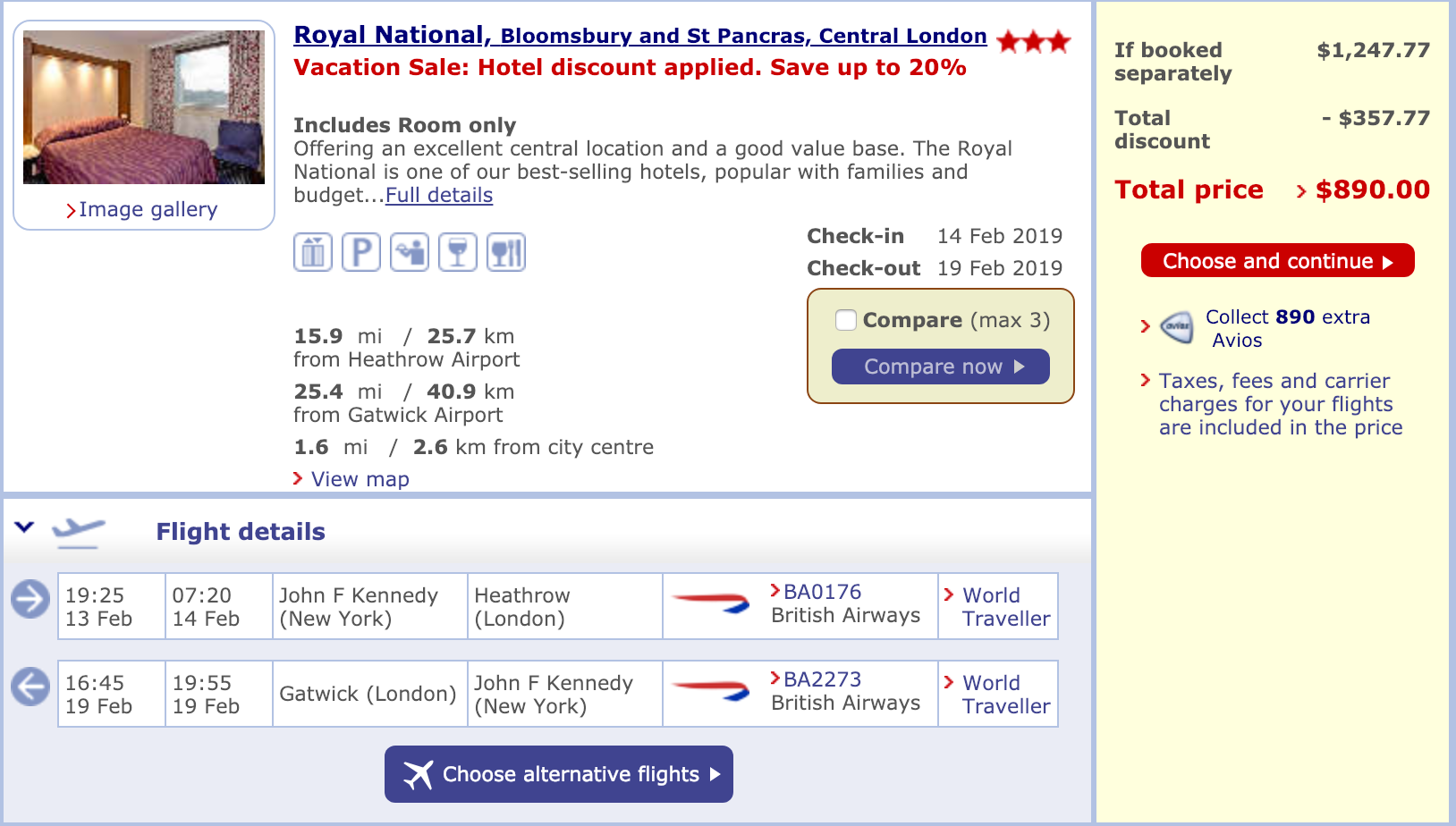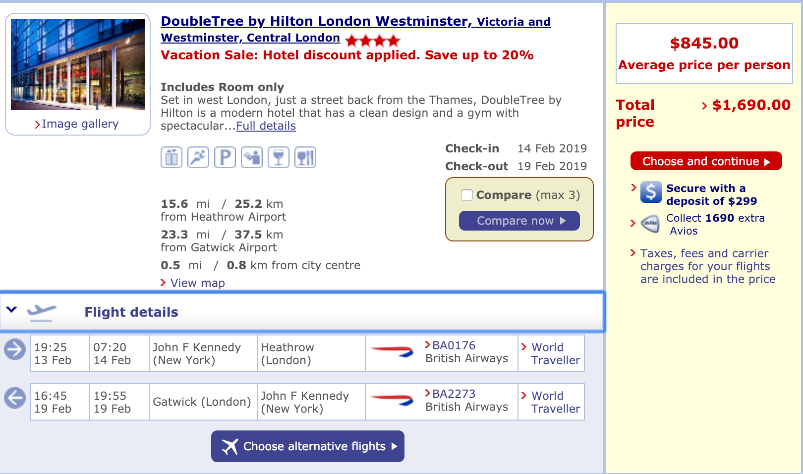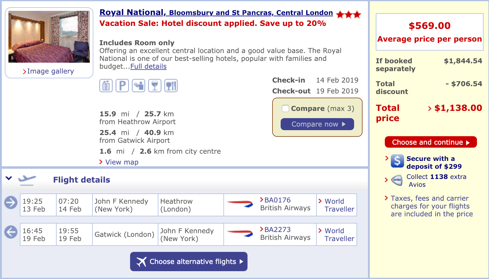 London is notorious for insanely expensive hotel rates. The current British Airways promotion is a great deal -- especially for those looking to experience Europe on a budget. Accommodations range from entry level hotels like The Royal National Hotel to full-service properties like DoubleTree Hotels and other mid-tier brands. However, not every hotel and airfare package features the discounted rates currently offered via this promotion. Look for the bold red text below the property name that reads "Vacation Sale: Hotel discount applied. Save up to 20%" to determine if your desired vacation package is part of the sale.