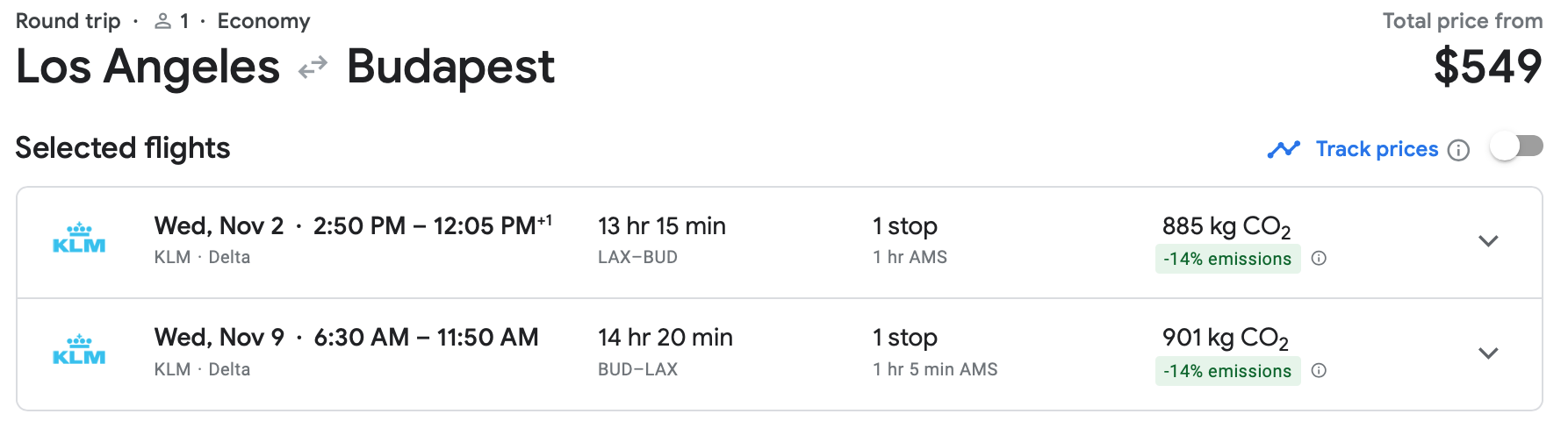 You can book a ticket on KLM in early November from Los Angeles International Airport (LAX) to Budapest Airport (BUD) for just $549 round-trip. There's a brief layover in Amsterdam each way and as noted above a checked bag will cost you $75 each way. Still, that's a nice price for this route.