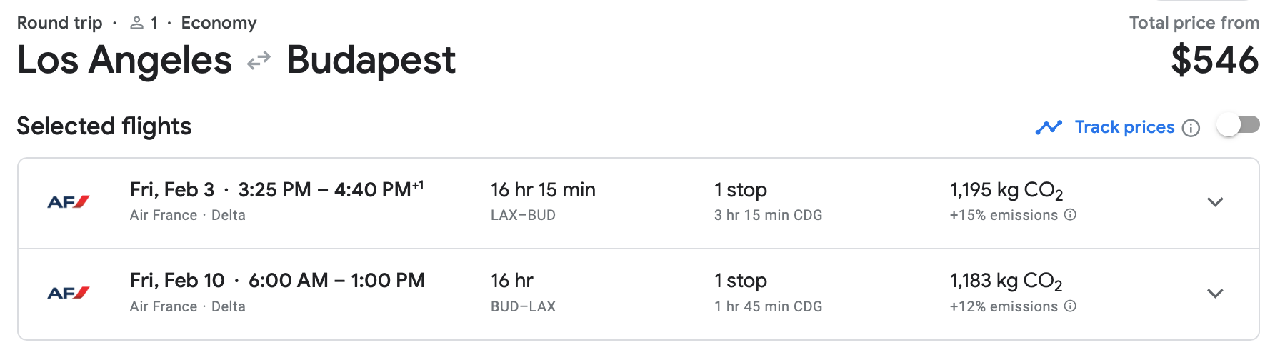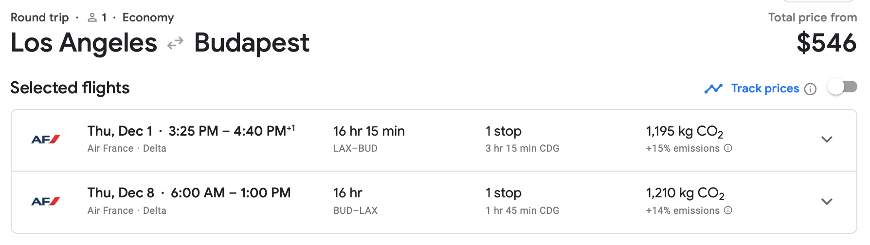 Air France has the same route available in December for just $546. This is an excellent price for a December trip from the West Coast to Hungary.