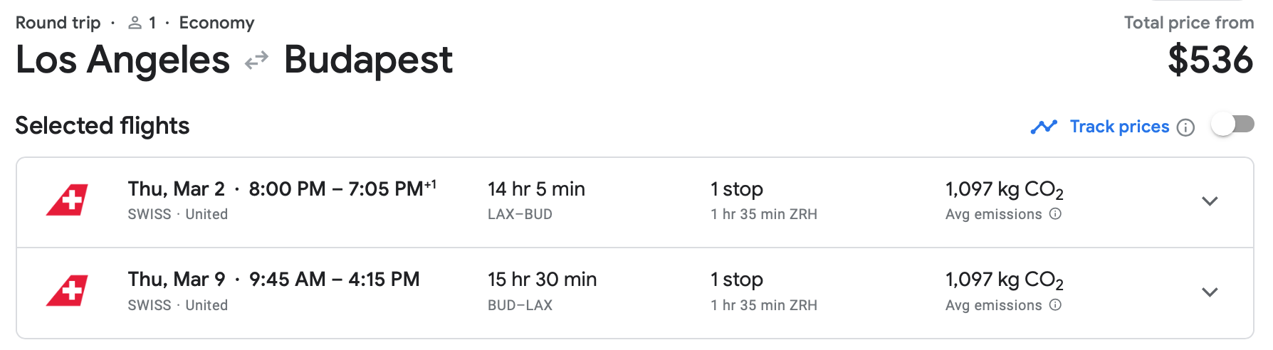 If you prefer to travel in March, you can find even cheaper prices. Swiss has flights from LAX to Budapest at that time for only $536 round-trip.