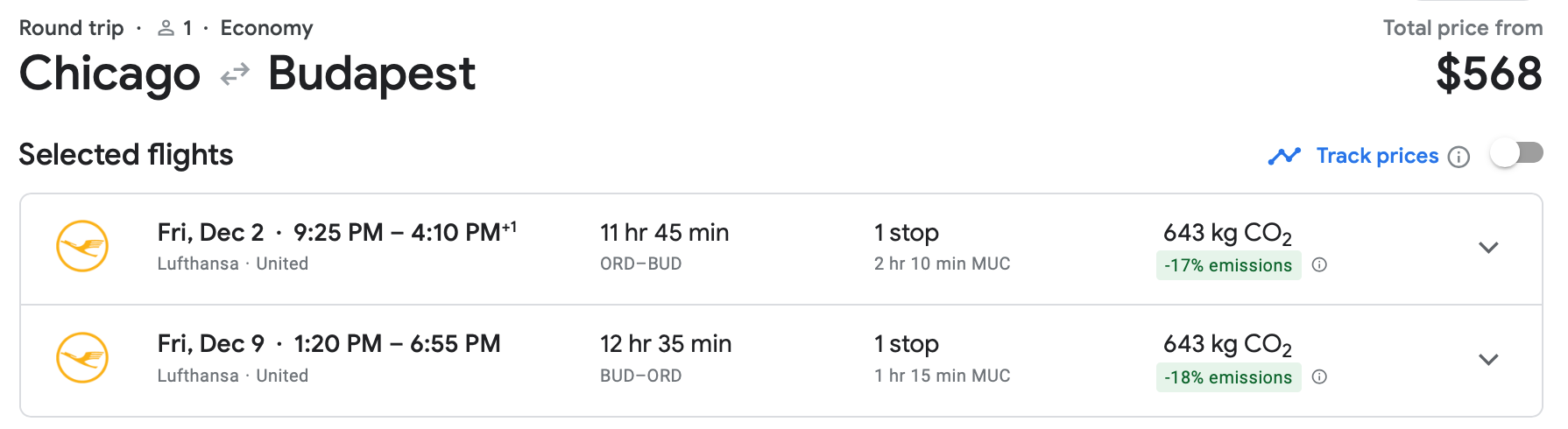 We'll end with a fantastic bargain we found out of Chicago. You can book a round-trip ticket from O'Hare International Airport (ORD) to Budapest on Lufthansa in early December for only $568. This ticket would typically cost more than $1,000, so this is a steep discount.