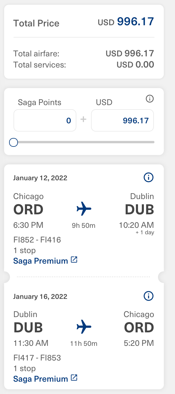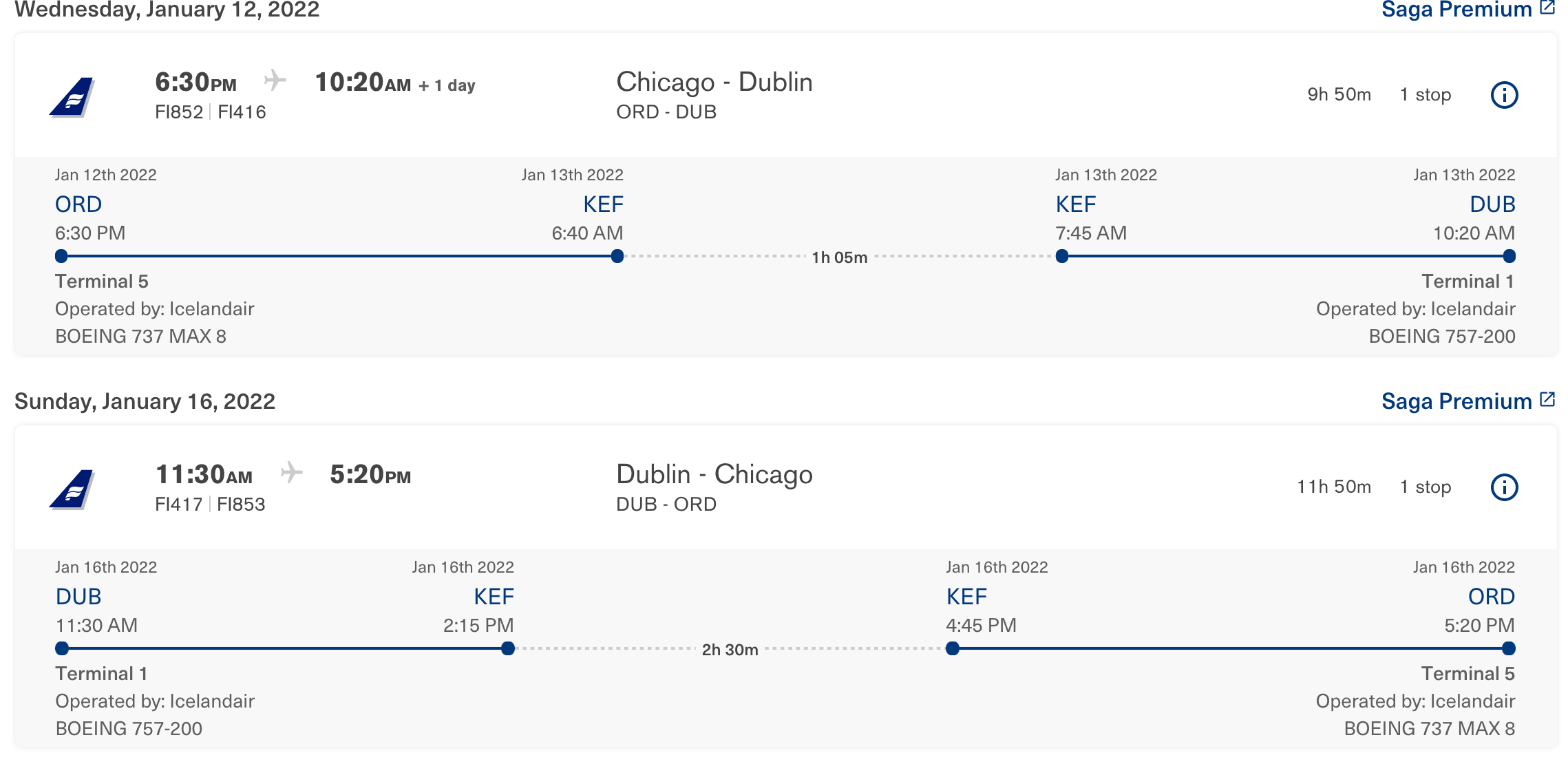 Icelandair's business class is called "Saga Premium," so be sure to look for that fare type while booking, as illustrated below. For example, you could take the below flight in mid-January from Chicago to Dublin for $996 round-trip.