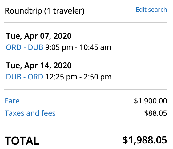 Chicago (ORD) to Dublin (DUB) for $1,988 round-trip in United Polaris: