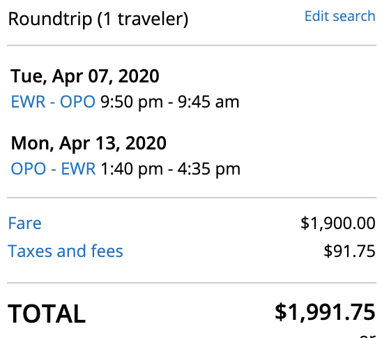 Newark (EWR) to Porto (OPO) for $1,992 round-trip in United Polaris: