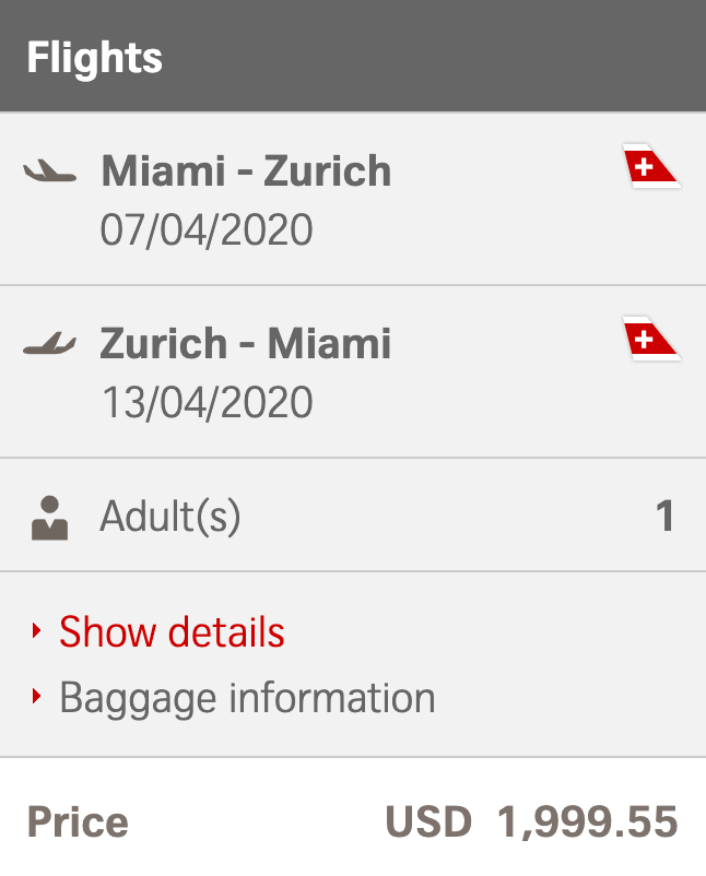 Miami (MIA) to Zurich (ZRH) for $2,000 round-trip in business class on Swiss Air:
