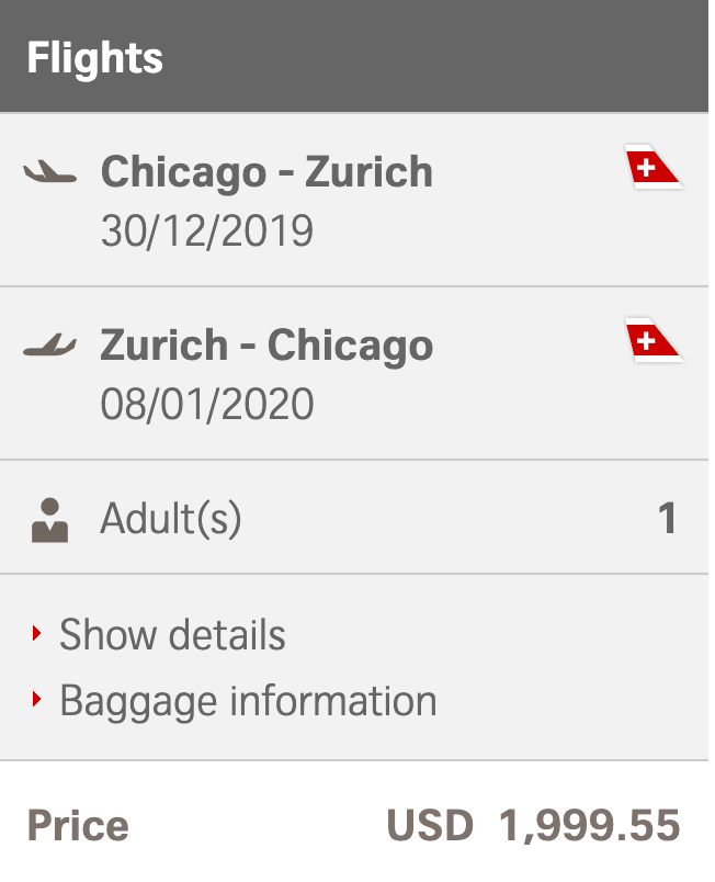 Chicago (ORD) to Zurich (ZRH) for $2,000 round-trip in business class on Swiss Air: