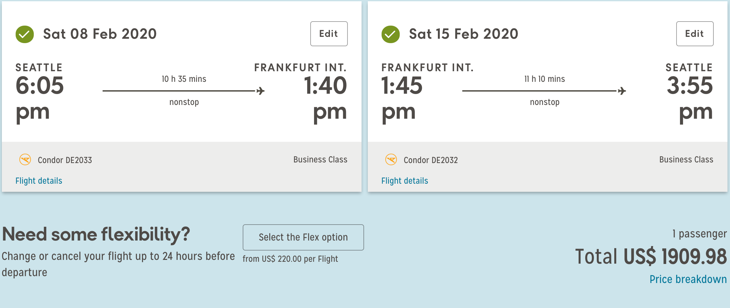 Seattle(SEA) to Frankfurt (FRA) for $1,910 round-trip in business class on Condor: