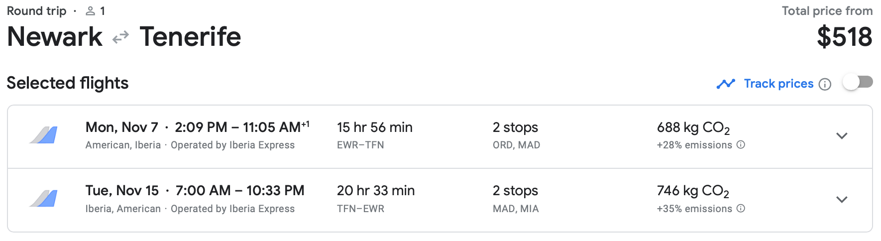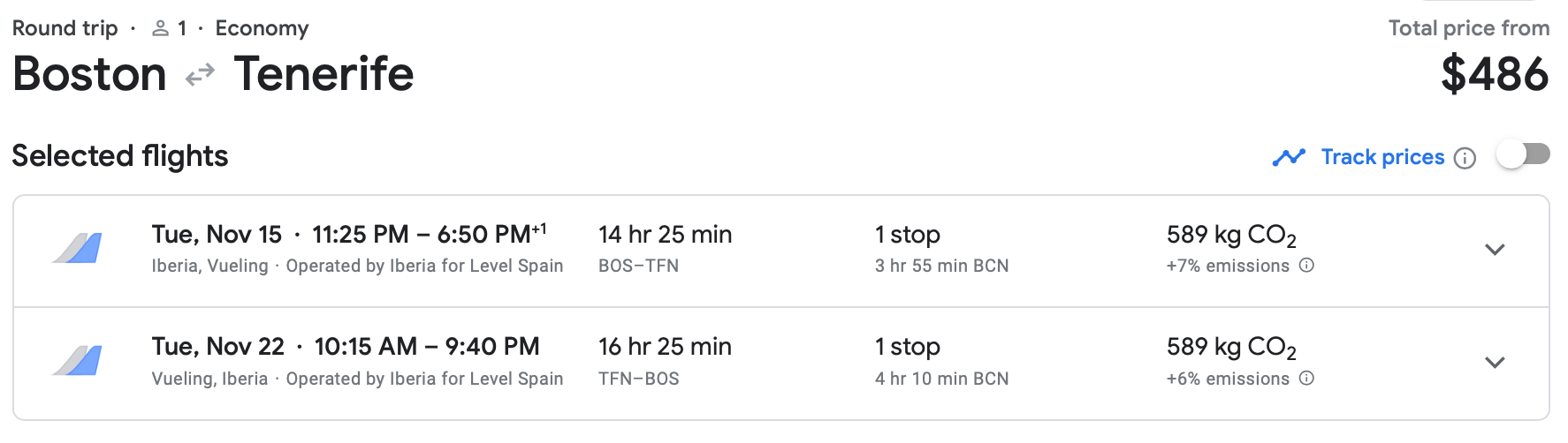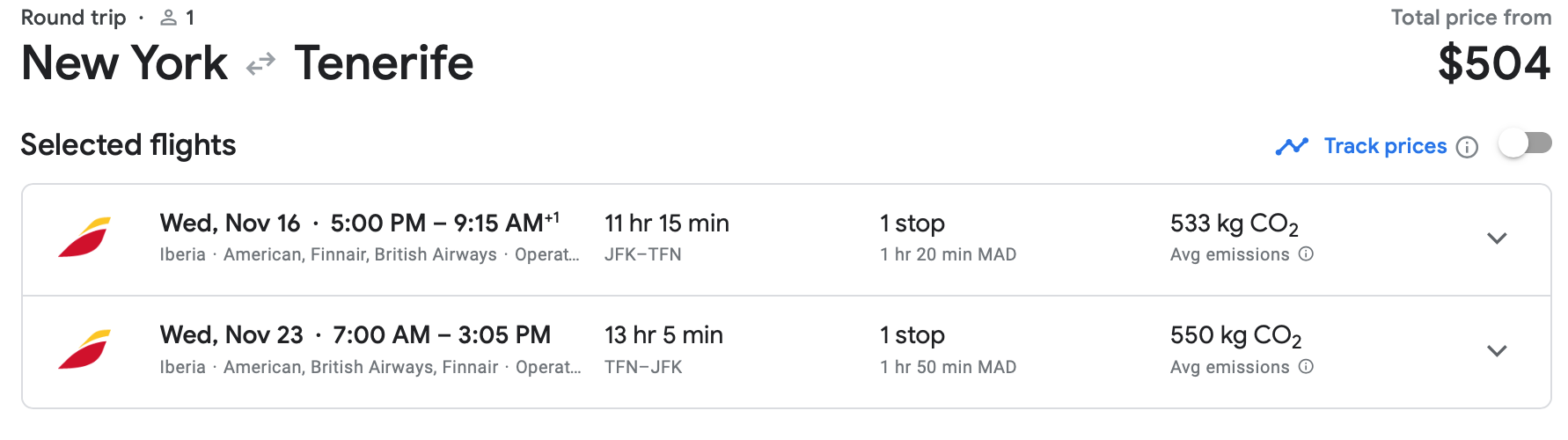 If you want to avoid having two layovers, you can fly out of New York City. Iberia has flights in November from John F. Kennedy International Airport (JFK) to Tenerife for $504 round-trip (with a layover in Madrid each way).