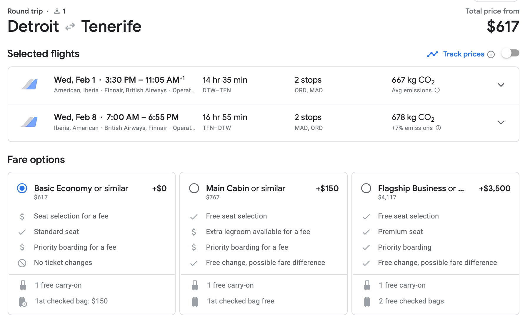 Iberia has flights from Detroit at a nice price, too. This itinerary in February costs just $617 round-trip. A couple of caveats: There are two stops, in Chicago and Madrid. Also, a checked bag for a basic economy ticket will cost $150. However, if you upgrade to the main cabin for $150, you get a free checked bag.