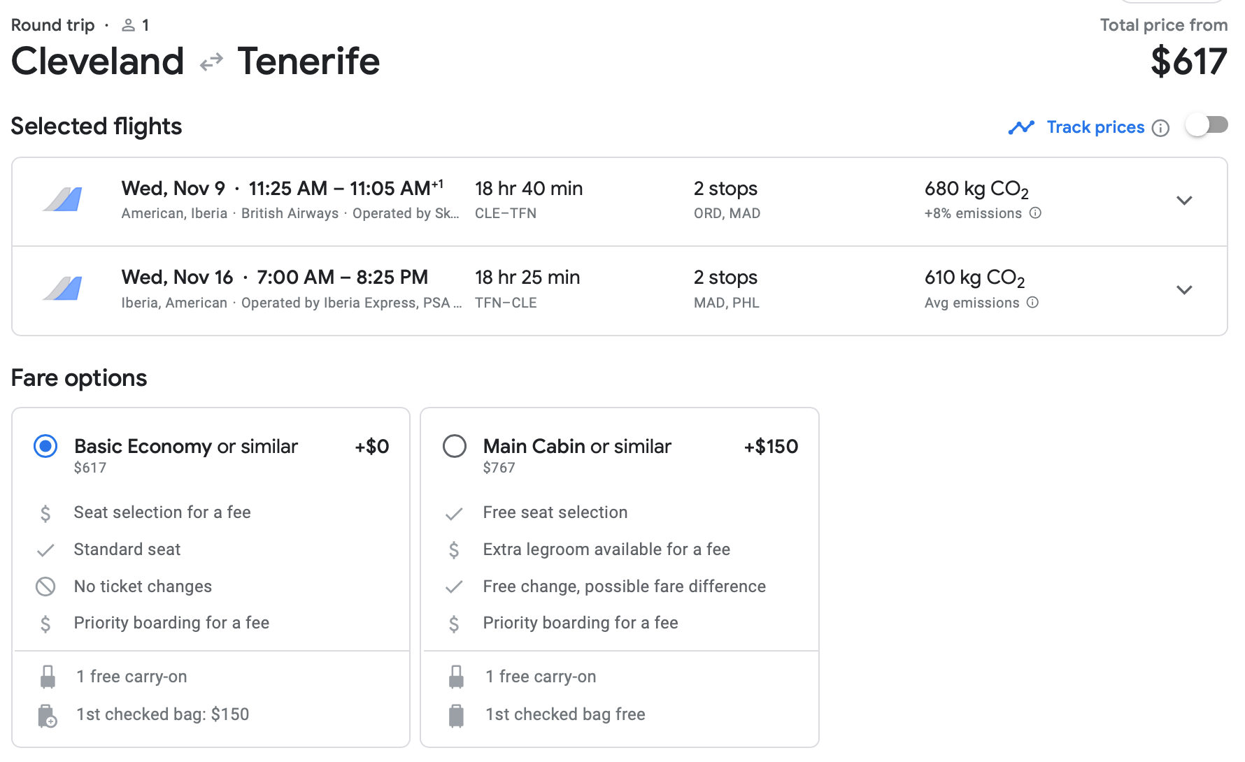 Here's a great price on a flight from Cleveland Hopkins International Airport (CLE) to Tenerife for $617 round-trip. Again, if you need to check a bag, upgrading to the main cabin is the way to go.