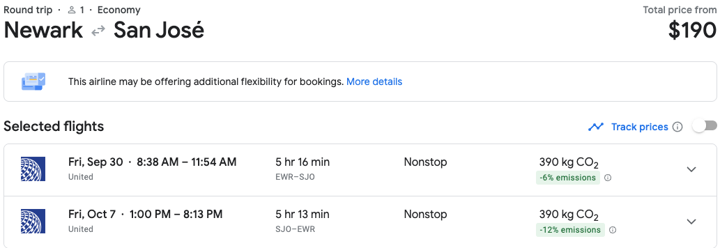 As mentioned, this deal includes fares on multiple airlines in economy class, so start by searching for this deal via Google Flights, as I did to find the below round-trip flight from Newark Liberty International Airport (EWR) to Juan Santamaría International Airport (SJO) in early October for $190 in United Airlines' basic economy.