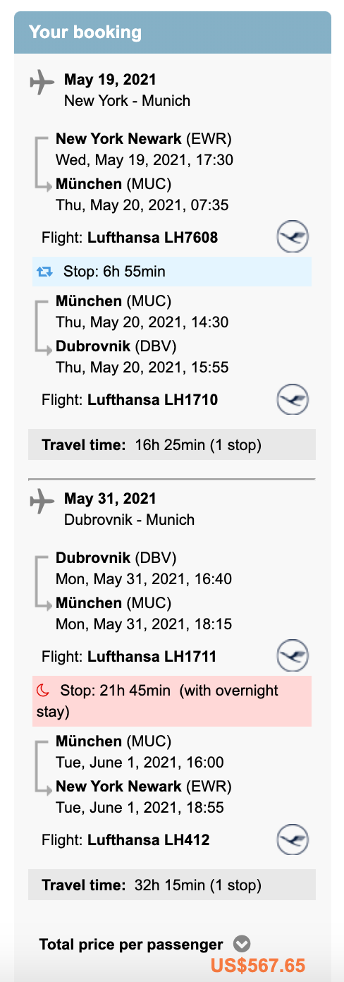 Newark (EWR) to Dubrovnik (DBV) for $568 round trip on United/Lufthansa in May via Gotogate: