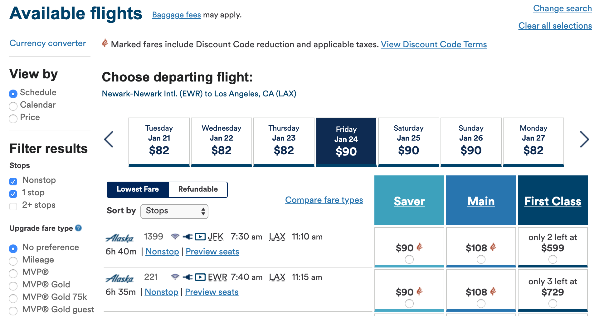 You'll have to book your ticket directly through Alaska Airlines, using promotion code IFLYALASKA, to get the discount, but you can still use Google Flights to find the cheapest dates. Enter your origin and destination cities, then scroll through the calendar function to find dates and prices that work for you. Once you've found the route you want, go back to alaskaair.com/happyhour to select your flights using the code IFLYALASKA. Sales-eligible fares will be marked with a special symbol and will already reflect the 20% discount.