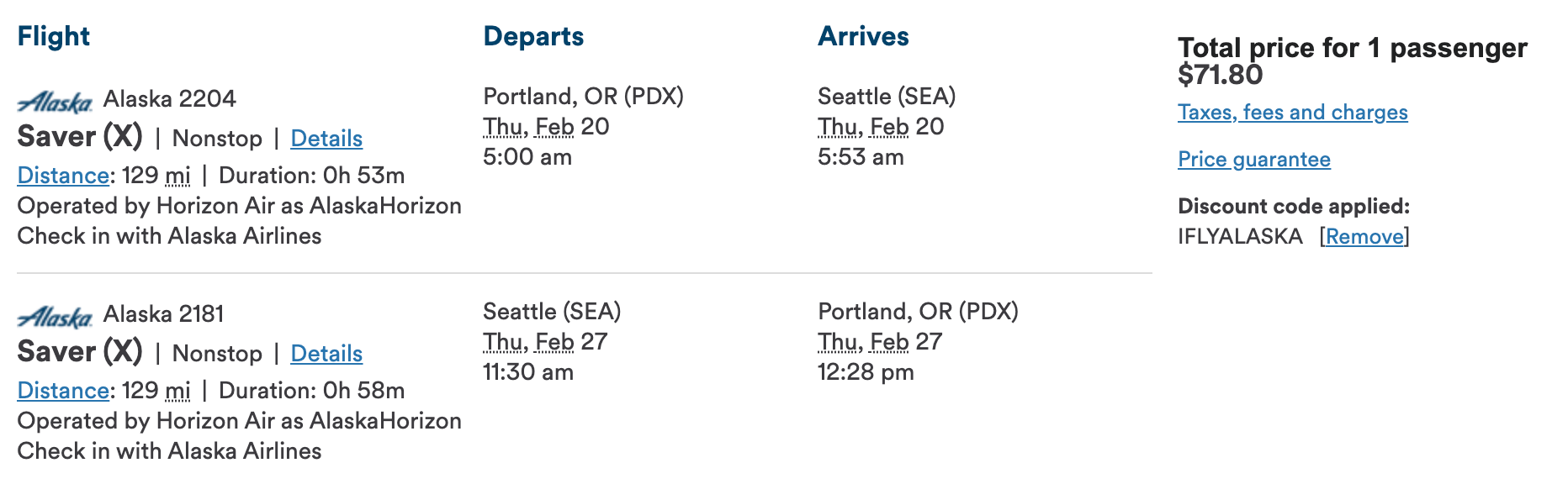 Portland (PDX) to Seattle (SEA) in February for $72 round-trip nonstop: