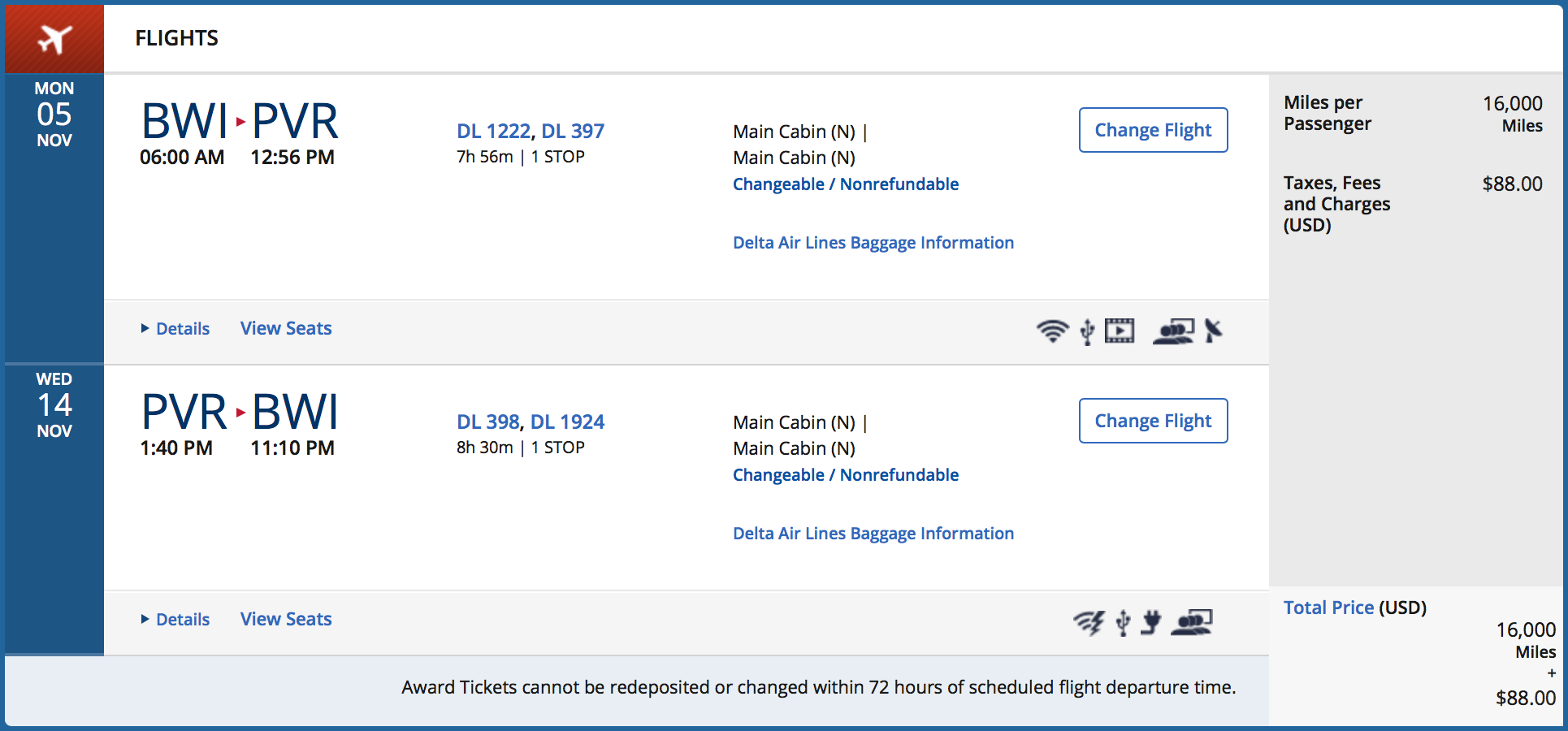 Baltimore (BWI) to Puerto Vallarta (PVR) for 16,000 miles + $88 in taxes and fees round-trip in November: