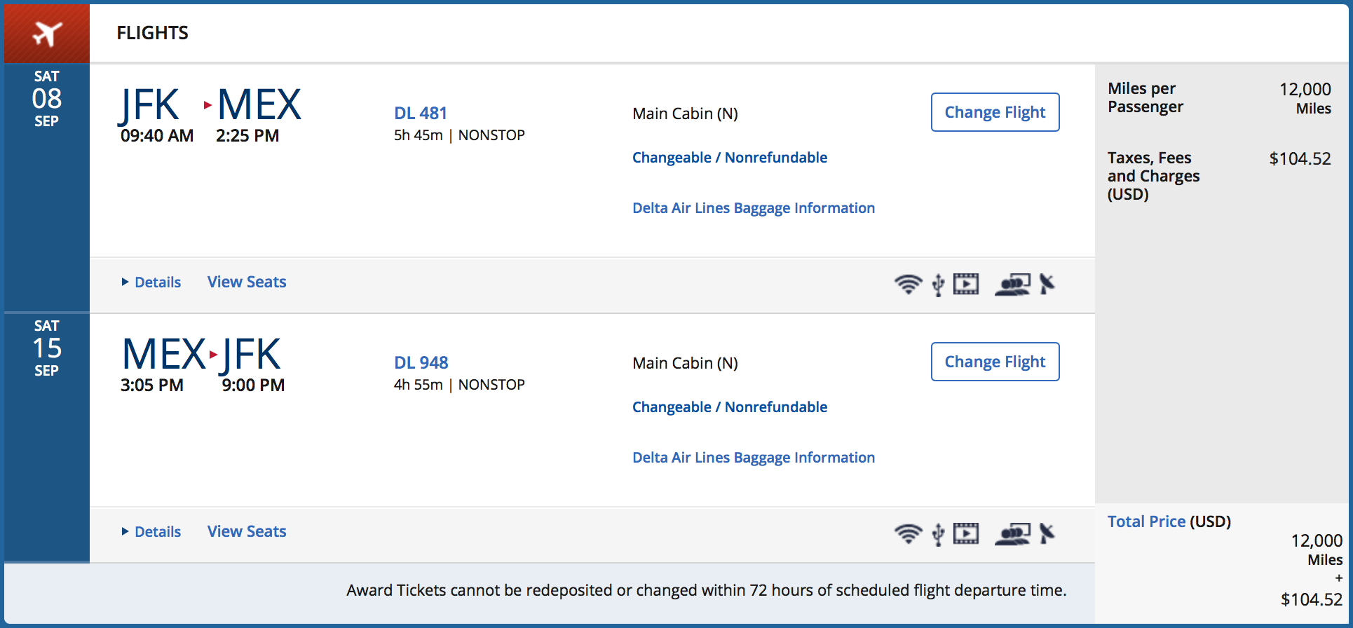 Delta frequently has flash sales for award flights featuring fantastic deals such as flights to Asia for 50,000 SkyMiles round-trip, South America from 36,000 SkyMiles round-trip or Europe from 32,000 SkyMiles round-trip. Back in April we shared an unpublished promotion which offered award flights to Mexico for as little as 12,000 SkyMiles round-trip and it's back! The discounted awards are available from at least a dozen cities throughout the US and we're seeing availability through May 2019. The sale includes a ton of non-stop flight options from Delta's hubs, as well as options over holidays like Columbus Day and Veterans Day. The only downside with these awards is that taxes will set you back at least $80.