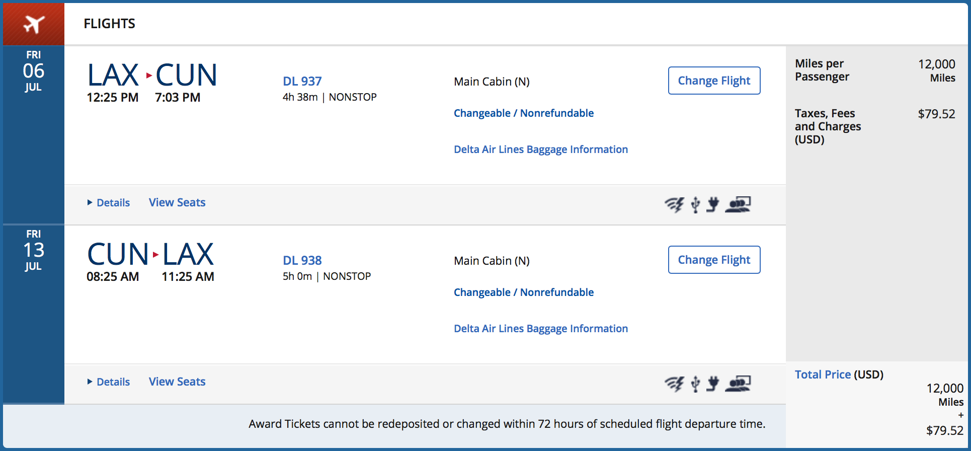 Cost: 12,000+ SkyMiles and $80+ round-trip in economy