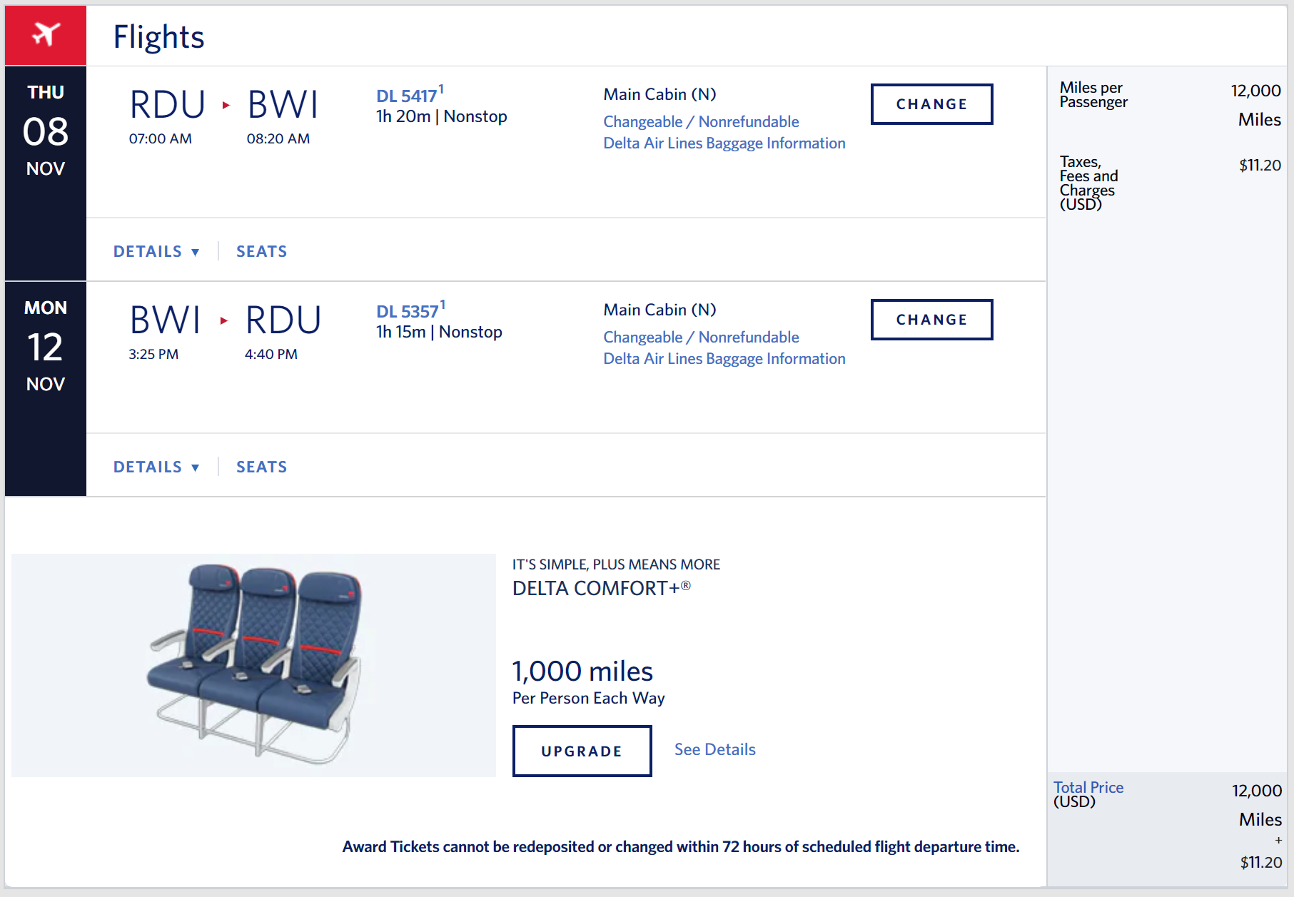 Raleigh/Durham (RDU) to Baltimore (BWI) for 12,000 miles + $11 in taxes and fees round-trip nonstop: