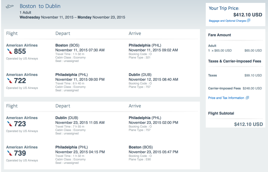 Boston-Dublin for $412 on American Airlines (earns 7,104 EQMs):