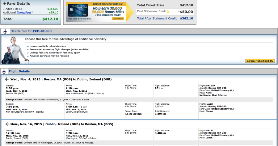 Boston-Dublin for $413 on United Airlines (earns 7,211 PQMs):