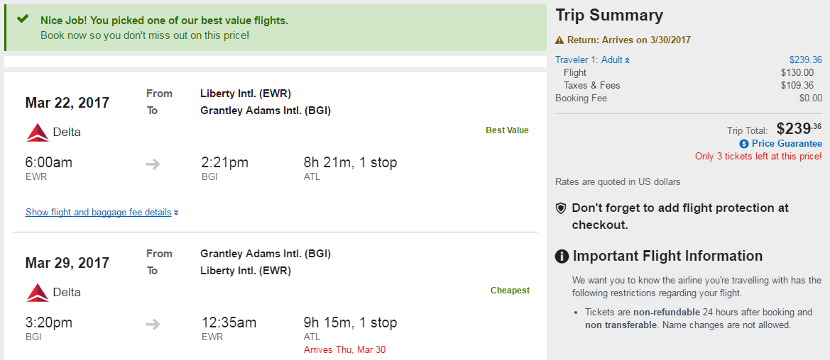 Newark (EWR) to Bridgetown, Barbados (BGI) for $239 round-trip in March via Orbitz: