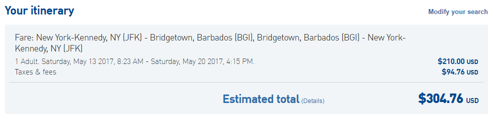 New York's JFK to Bridgetown, Barbados (BGI) for $305 round-trip in May on JetBlue: