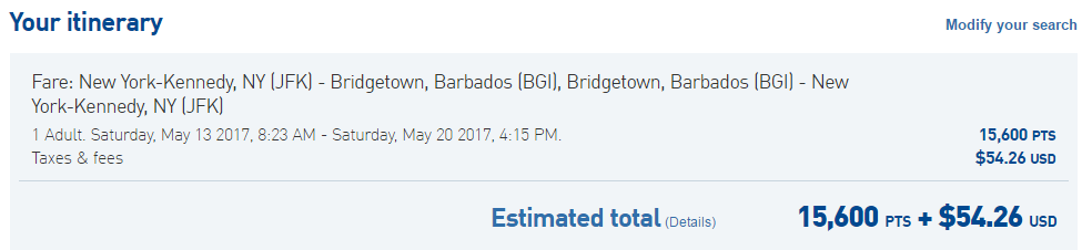 New York's JFK to Bridgetown, Barbados (BGI) for 15,600 points + $54 round-trip in May on JetBlue: