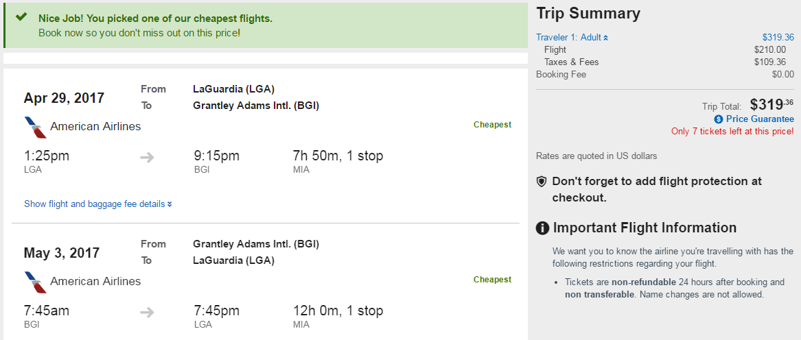 New York's LGA to Bridgetown, Barbados (BGI) for $319 round-trip in April/May via Orbitz: