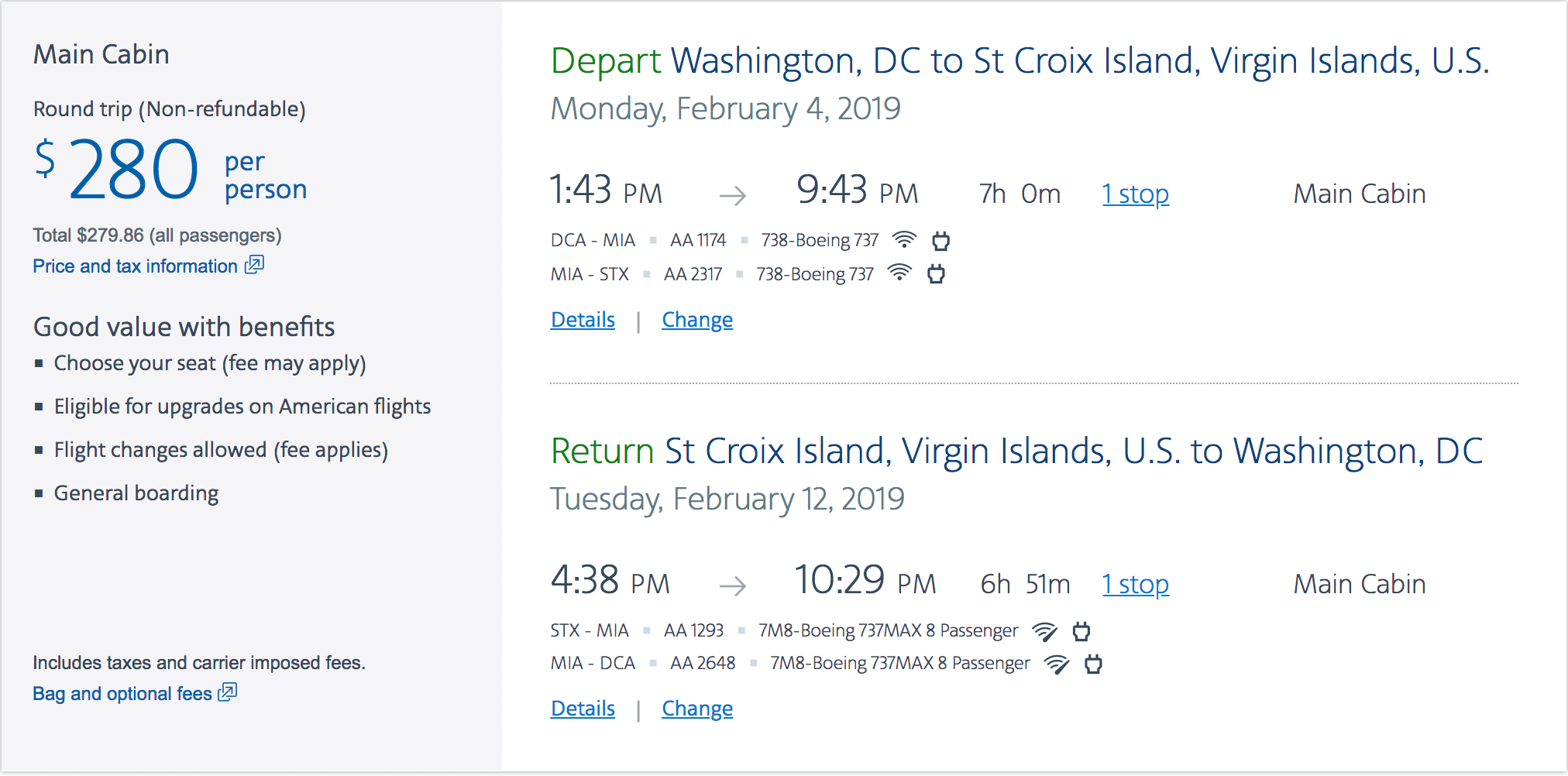 Washington, DC (DCA) to St. Croix (STX) for $280 round-trip on American Airlines: