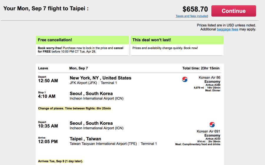 New York to Taipei on Korean Air for $658.70 (bookable on Orbitz)
