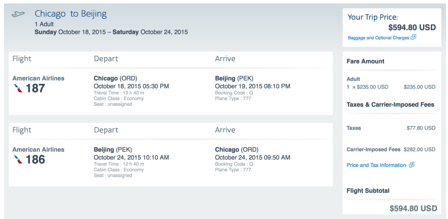 Chicago to Beijing on American Airlines for $594.80 (earns 13,160 EQMs)