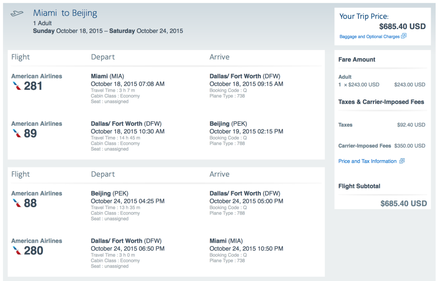 Miami to Beijing on American Airlines for $685.40 (earns 16,190 EQMs)
