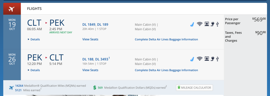 Charlotte, NC to Beijing for $659 on Delta (earns 14,262 MQMs)