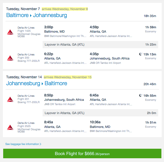 Baltimore (BWI) to Johannesburg, South Africa (JNB) for $666 round-trip via Priceline: