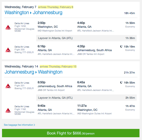 If you've been dreaming about a safari, this is a great opportunity to score a terrific price on flights to the biggest city in South Africa. We're currently seeing airfares as low as $666 round-trip from multiple US cities — including rarely seen Washington, DC (IAD/DCA) as well as New York (LGA/JFK), Baltimore (BWI), Boston (BOS), Miami (MIA), Philadelphia (PHL) and even Chicago (ORD) — to Johannesburg, South Africa (JNB) on Delta Airlines.